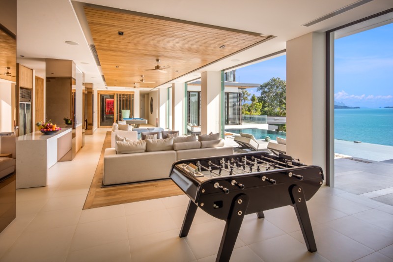 Из главной гостиной открывается прямой выход на террасу через стеклянную стену во всю стену. С одной стороны комнаты расположен бильярдный стол, с другой — настольный футбол, и всё продумано для удобного перемещения как внутри, так и снаружи.