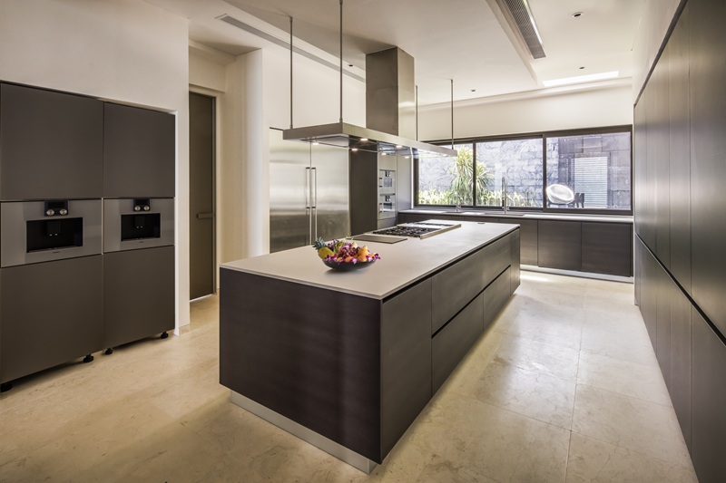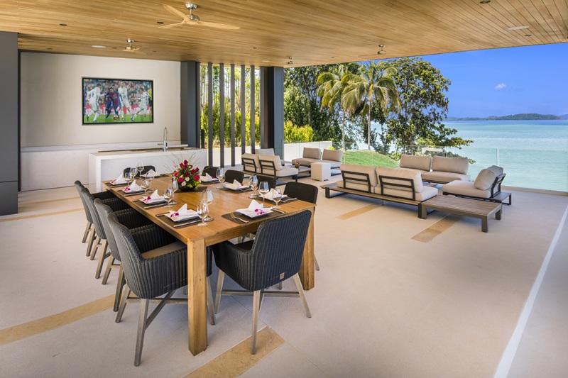В помещении есть обеденная зона, достаточно просторная для официального ужина и удобная для неформальных трапез. Открытая кухня служит центром пространства, а отдельная кухня в задней части дома предназначена для приготовления более крупных блюд, включая то, что может приготовить личный повар.