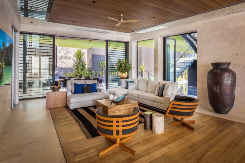 Гостиная — это изюминка: огромное пространство с деревянная двускатная крыша, мраморные колонны и скульптурное освещение, создающее одновременно величественную и расслабляющую атмосферу.