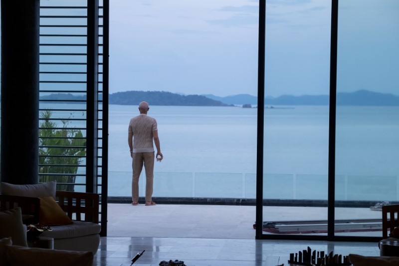 Третий сезон во многом опирается на визуальную драму виллы — огромные резные двери, потолки, похожие на соборные, и широко открытая гостиная, которая обрамляет Андаманское море, словно заставка.