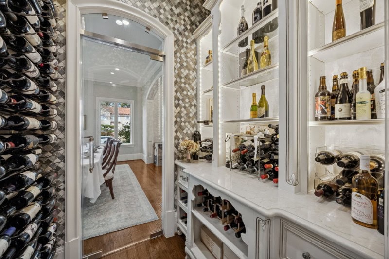 The layout flows directly into a temperature-controlled wine cellar, which acts as a natural bridge into the dining room.