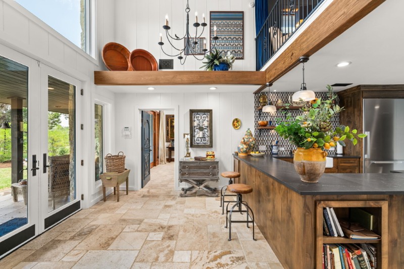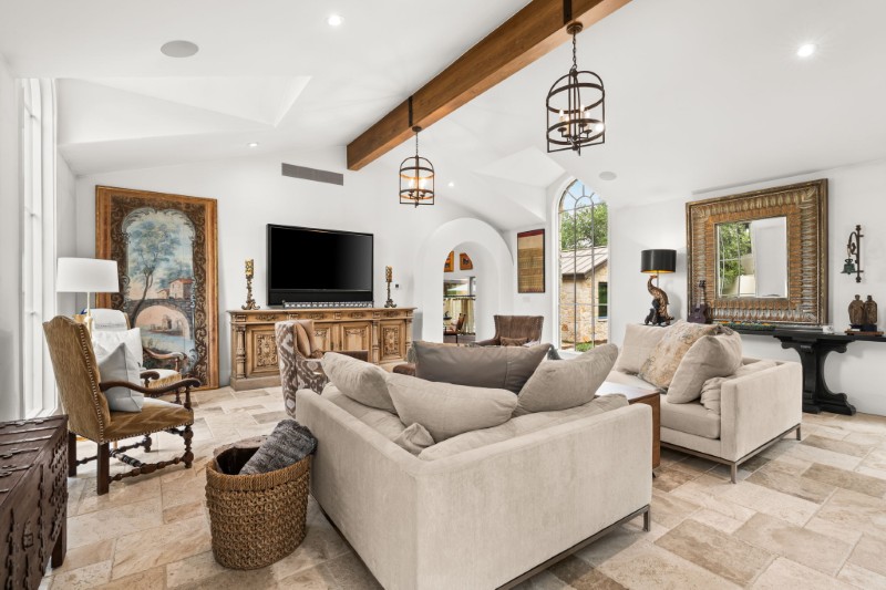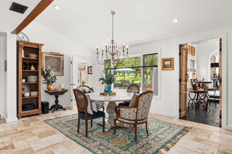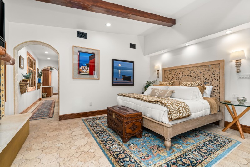 Главный дом площадью 4049 квадратных футов (4049 кв. футов) украшен богатыми деревянными балками, марокканской и испанской плиткой ручной работы и импортной сантехникой. Планировка гармонично сочетает укромные уголки с просторными зонами для отдыха, позволяя легко переходить от тихих утренних посиделок к полноценным встречам.