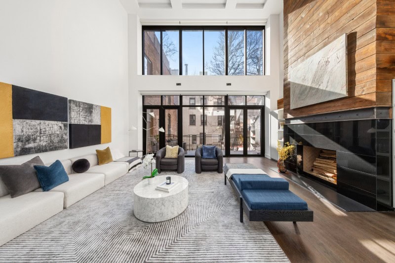 A grand living room with soaring 22-foot ceilings is framed by a floor-to-ceiling glass wall that opens directly to a garden-facing balcony. The scale feels closer to a loft than a townhouse, while a wood-burning fireplace anchors the space and adds warmth.