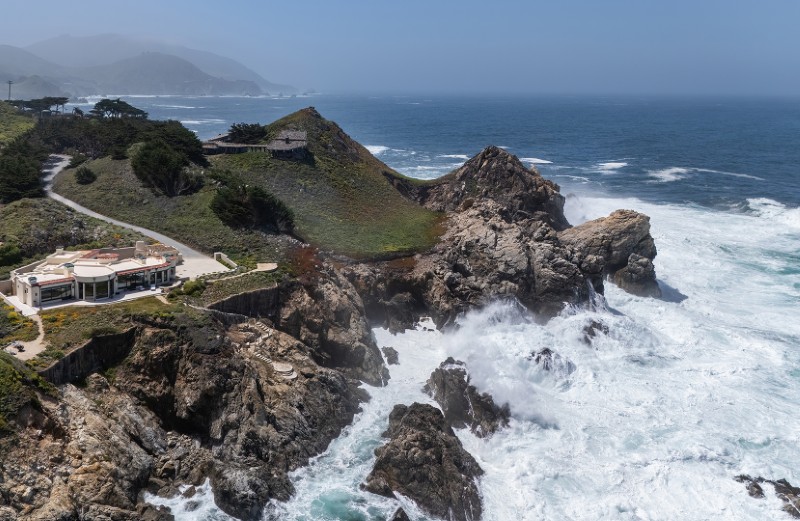 Occupying 2.8 acres with roughly 400 feet of direct ocean frontage, the property sits along one of the most dramatic stretches of Highway 1, inside the gated Sea Meadow community.