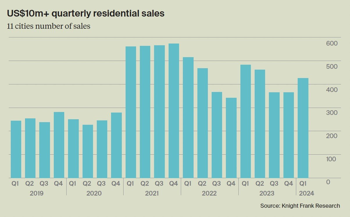 According to new data from Knight Frank, there were 426 sales of properties valued at over $10 million in the first three months of 2024 across 11 tracked markets. This is an increase from the 365 sales in the previous quarter but represents a 11.6% annual decrease compared to the 482 sales in Q1 2023.
