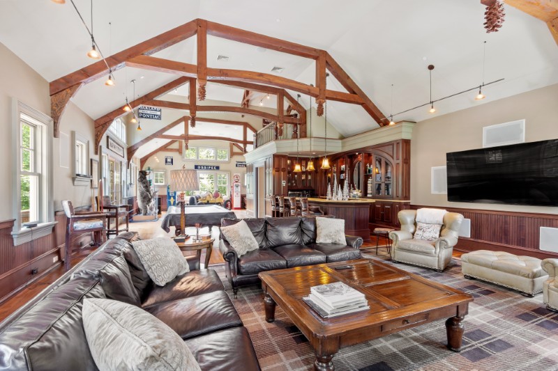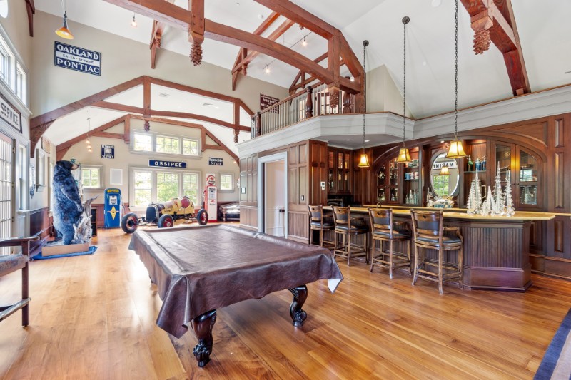 The home features multiple fireplaces, a custom wine cellar, and a billiard room with a bar, making it perfect for everything from holiday gatherings to late-night lake parties.