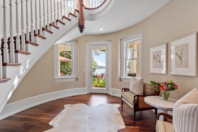 The layout is designed for gathering, with two dining rooms, two living rooms, and an amazing office that looks out toward the water.