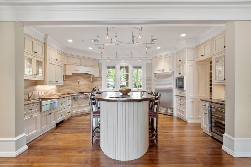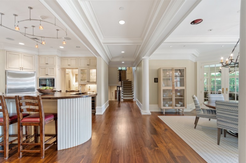 The chef’s kitchen is built for serious cooking, with a large walk-in pantry and top-of-the-line appliances, while still keeping a casual flow for everyday life.