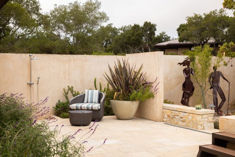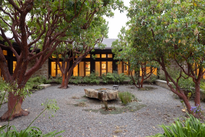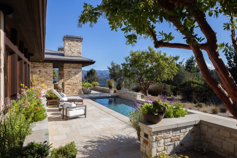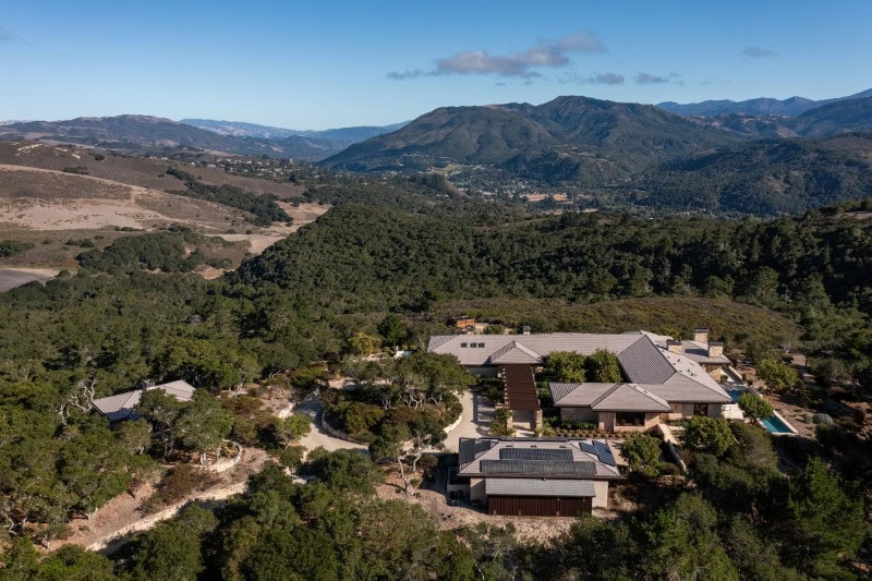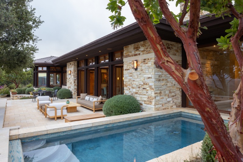 The exterior is finished in San Ardo stone, grounding the home visually in its surroundings.