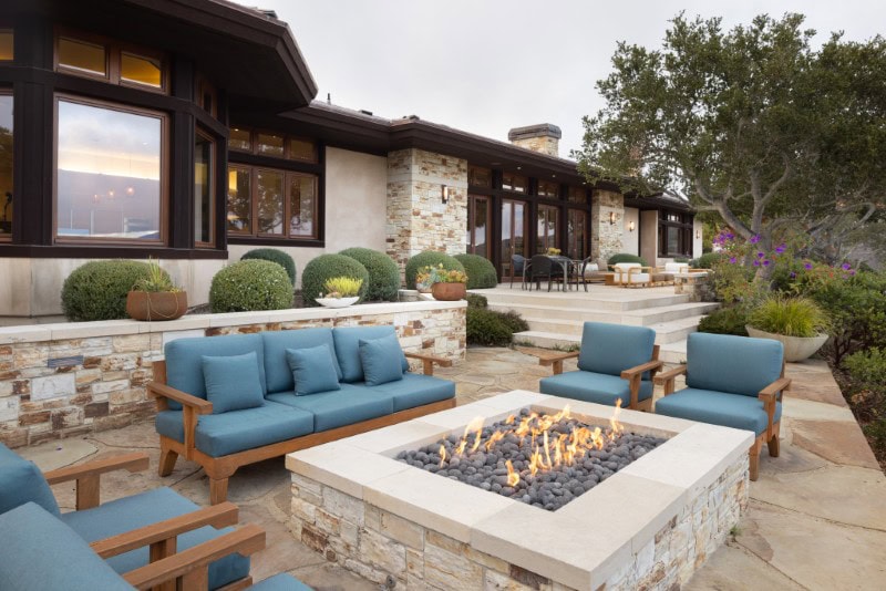 Indoor-outdoor living across terraces with fire pits