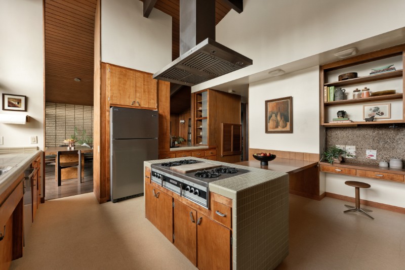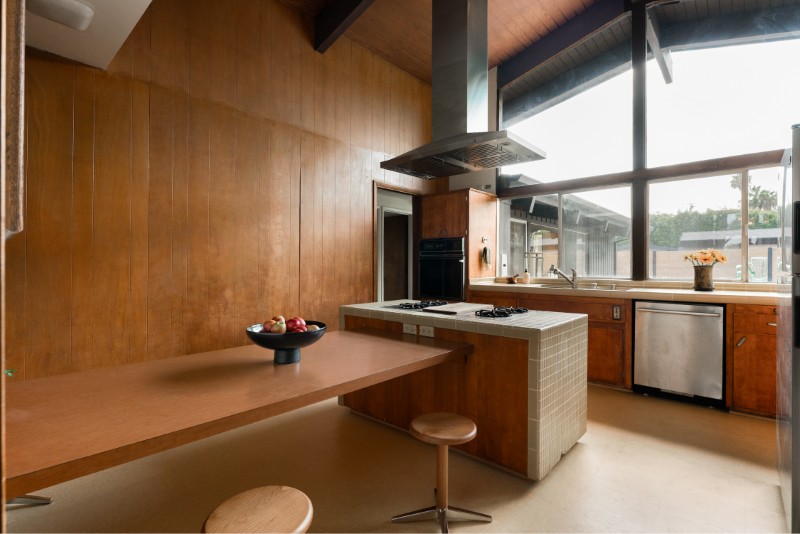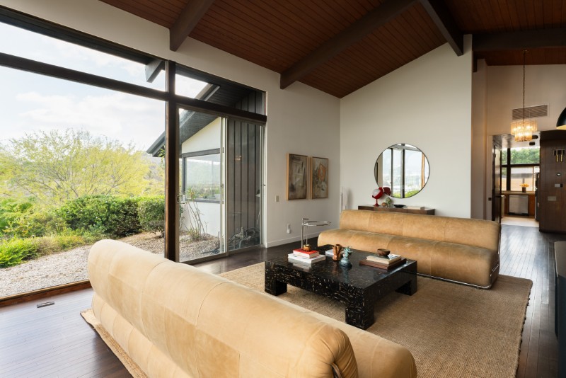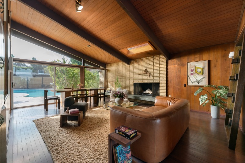 Inside, original wood accents, built-ins, and vaulted ceilings celebrate the timeless appeal of mid-century design. Skylights and floor-to-ceiling windows invite natural light throughout the day, while hardwood floors and natural materials keep the interiors warm and inviting.